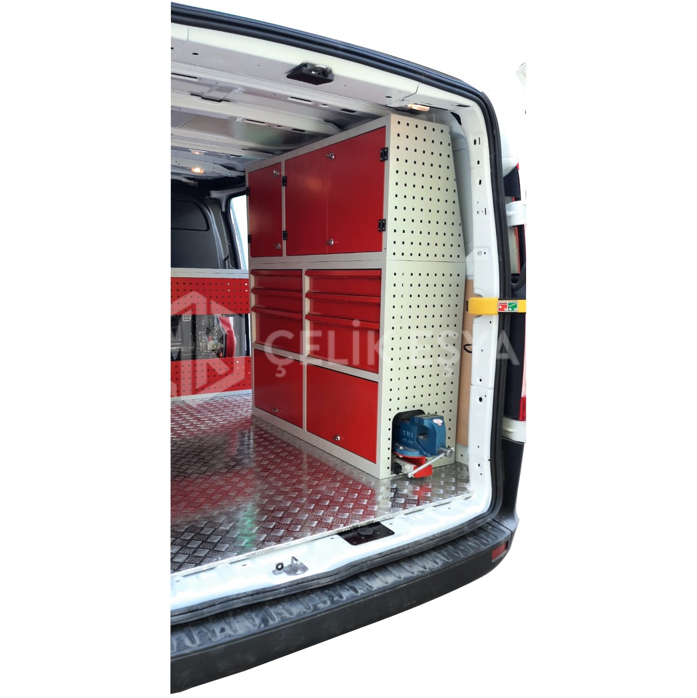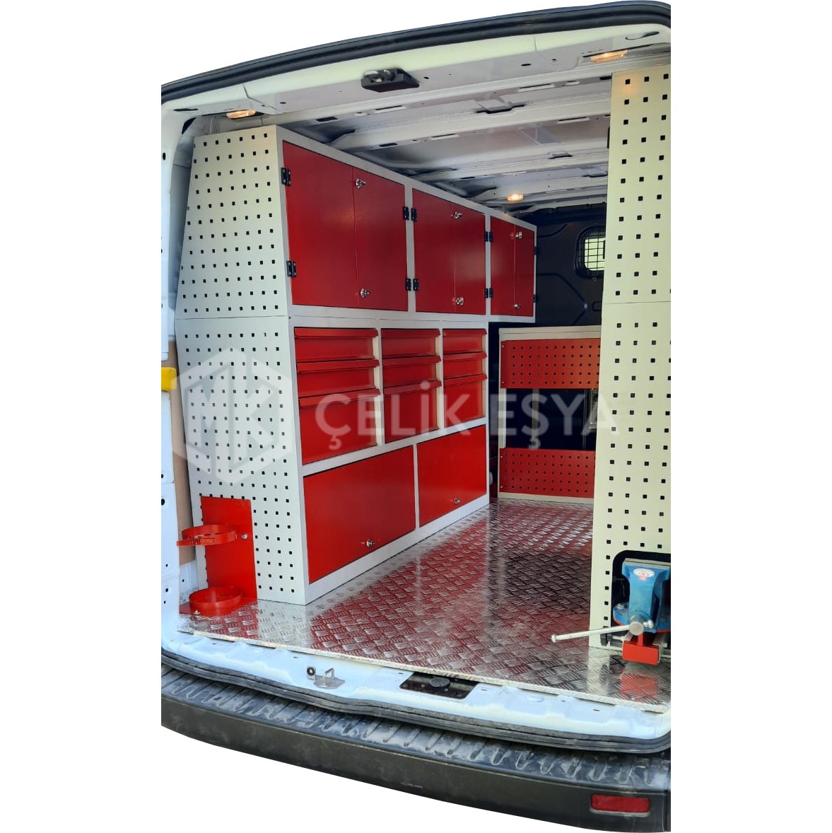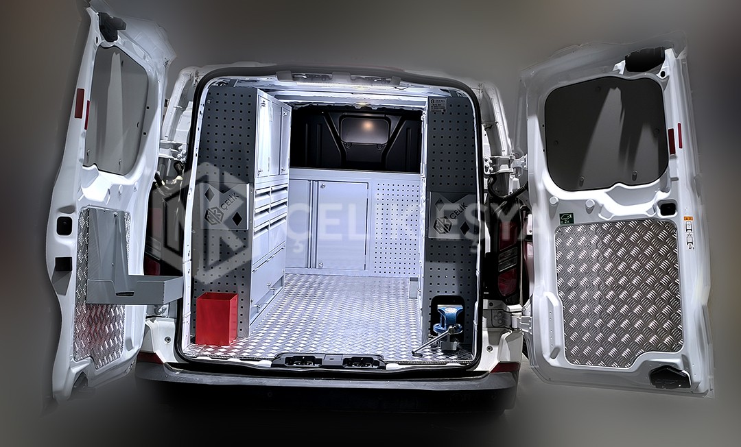 Araç içi raf ve dolap sistemlerimiz, birçok farklı sektörde faaliyet gösteren firmaların ihtiyaçlarını göz önünde bulundurarak tasarlanıp üretilmektedir. Özellikle yerinde servis hizmeti veren firmaların bakım aracı ihtiyaçlarını karşılamaktadır. Bu tarz servis ve bakım araçlarının ihtiyaç duyduğu alet ve edevatların derli toplu muhafazası sağlanır. Ayrıca araç içinin fonksiyonel kullanımının yanında görsel olarak da zenginleştirir.
