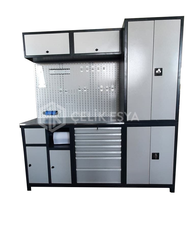 Endüstriyel çalışma tezgahı modellerimiz de standart olarak masa üzeri 30 mm kalınlıktaki mdf veya 5 mm kalınlıktaki sactan oluşmaktadır. Fakat özel isteğe göre paslanmaz sac veya galvaniz sac gibi seçeneklerimiz de bulunmaktadır. Tezgah üstü çalışma yüzeyleri pvc veya kauçuk kaplama ile kaplanabilir. Karanlık ortamlarda ışığa ihtiyaç bulunur ve bu nedenle aydınlatmalı çalışma tezgahı modellerimizde on ve off tuşlu florasanlı aydınlatmalarımız bulunmaktadır. Takım asma panosu bölümü ise 1.2 mm kalınlıktaki sactan ve profil desteklerden oluşmaktadır. El aletlerini ve iş ekipmanlarınızı takım asma panosuna asarak , iş yerinde düzenli bir görünüm elde edebilir, el aletlerinizin kaybolmasını önleyebilirsiniz. Bazı modellerimizde avadanlık rafı da bulunmaktadır. Avadanlık rafına bir takım hırdavat eşyalarınızı depolayabilirsiniz.